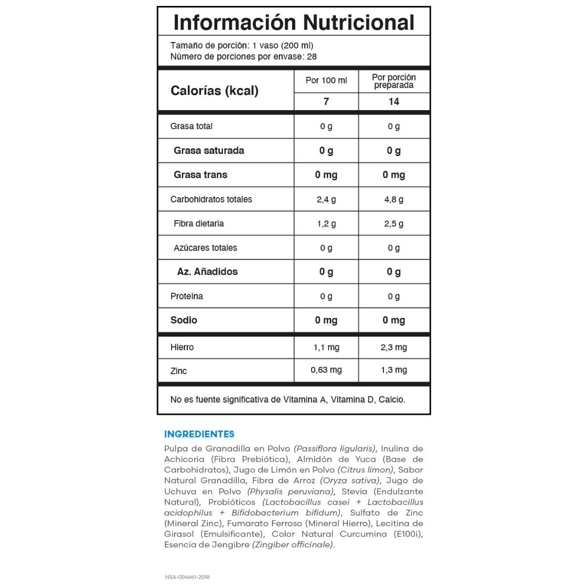 GRANADILLA + INULINA DE ACHICORIA + LIMÓN + UCHUVA + PROBIÓTICOS + ZINC + HIERRO
