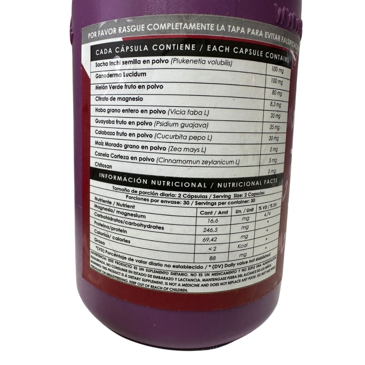 Componentes: Sacha inchi, Ganoderma, Melon verde, citrato de magnesio, haba, Guayaba, Calabaza, Maiz morado, Canela, Chitosan