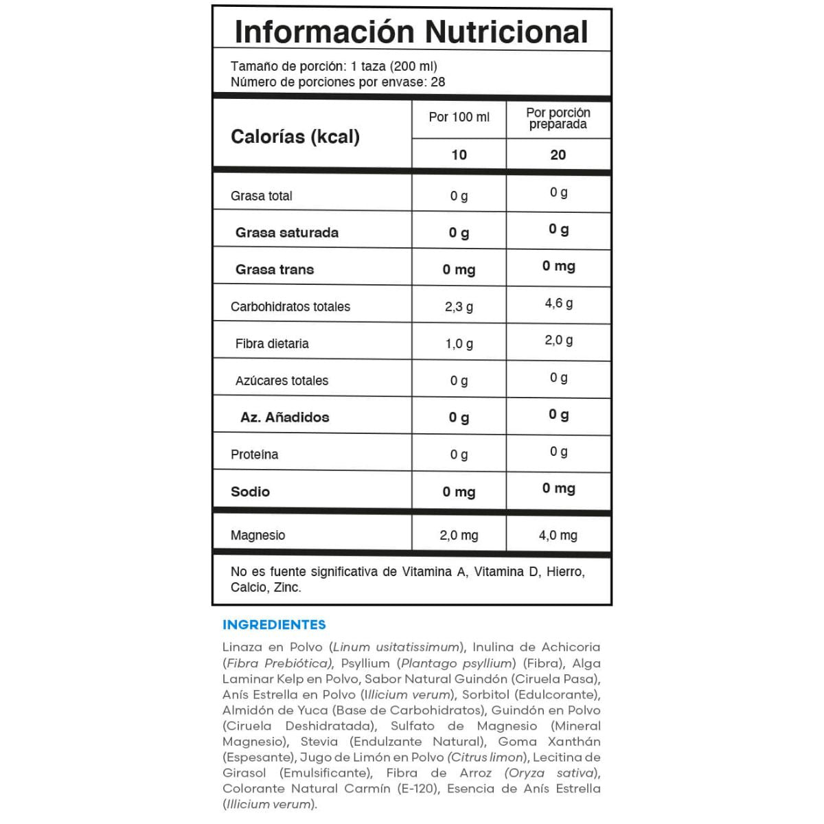 Fusión Nutracéutica: Mix de Fibras (Psylium, Inulina de achicoria, Mucílago de Linaza) Kelp, Anís Estrella, Extracto de Guindones.